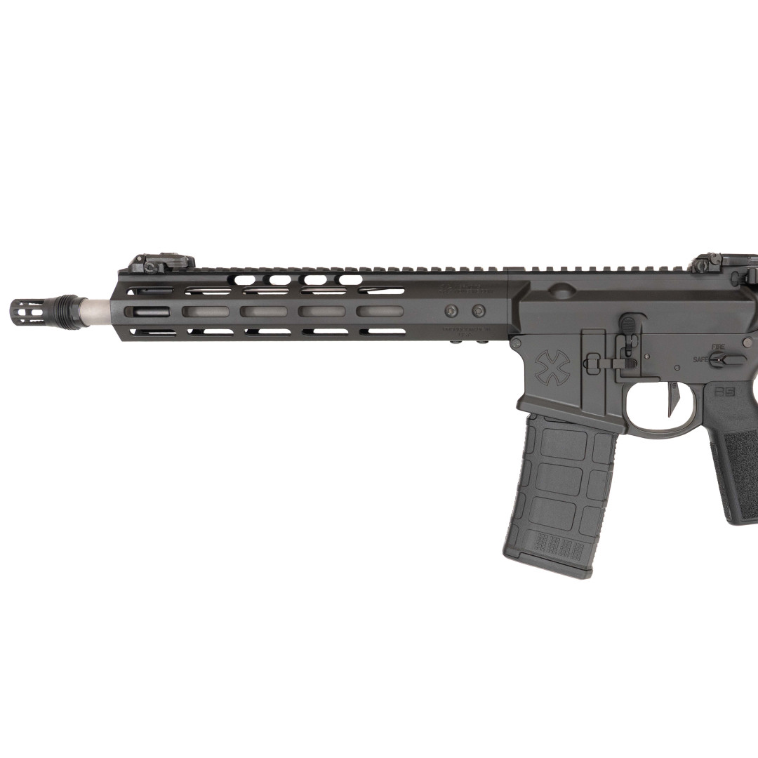 Model posiada lufę 12,5" ze stali nierdzewnej (SS) i konfigurację nastawioną na maksymalną funkcjonalność prosto z pudełka. Aluminiowe łoże NSR (M-LOK) zapewnia miejsce na montaż akcesoriów oraz wygodny chwyt, a górna szyna Picatinny umożliwia instalację optyki/dotów i osprzętu. W zestawie znajdują się stalowe, składane przyrządy celownicze Magpul MBUS Pro – idealne jako zapas do optyki.