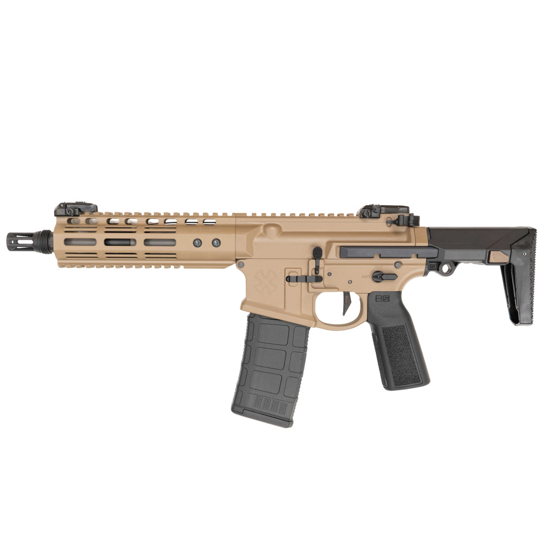 Na pokładzie jest konfiguracja nastawiona na jakość „prosto z pudełka”: spust Geissele Super Dynamic Enhanced (SD-E) o sportowym charakterze i czytelnej pracy, ambidextrous elementy sterujące (w tym Radian Talon 45/90), a także stalowe przyrządy Magpul MBUS Pro.