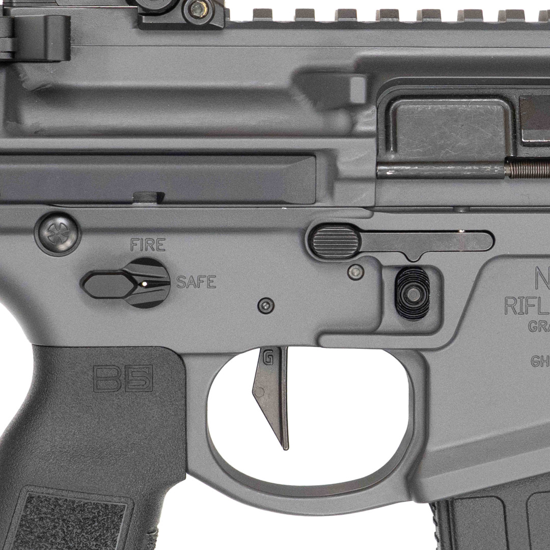 W tej konfiguracji producent zastosował komponenty, które realnie podnoszą ergonomię i kulturę pracy: Q BCG (komplet suwadła z zamkiem), ceniony mechanizm spustowy SD-E, obustronny selektor Talon, a także MBUS jako mechaniczne przyrządy celownicze. Całość domyka urządzenie wylotowe PIG PEN FH na gwincie 1/2×28, a wykończenie Sniper Grey Cerakote dodaje trwałości i świetnego „customowego” wyglądu. To sprzęt nastawiony na dynamiczne użytkowanie, wysoką powtarzalność działania i wygodę konfiguracji pod optykę oraz osprzęt.