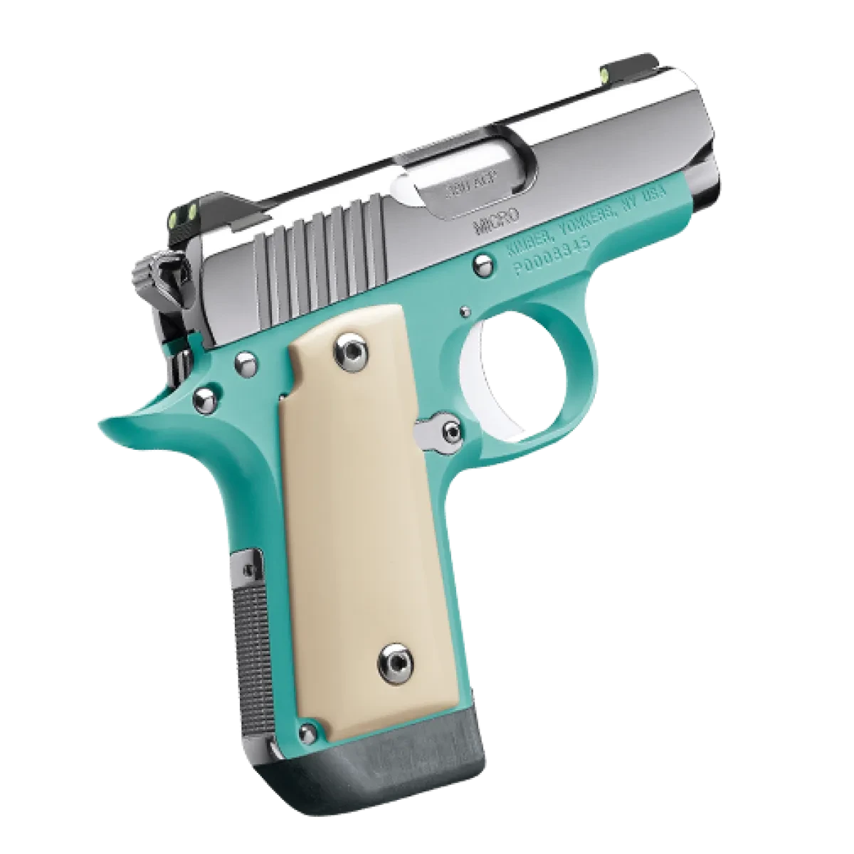 Kimber Micro 380 Bel Air NS łączy kompaktową funkcjonalność mini-1911 z wyjątkowym wykończeniem w stylu retro. Szkielet z kutego aluminium 7075-T6 anodowano na charakterystyczny odcień Bel Air Blue – pastelowy turkus nawiązujący do klasycznych samochodów lat 50. Lustrowo polerowany zamek ze stali nierdzewnej tworzy elegancki kontrast, a wszystkie krawędzie są sfazowane, by nic nie zahaczało o ubranie podczas szybkiego dobycia. Oznaczenie NS informuje o fabrycznym montażu trójpunktowych przyrządów Tru-Dot Tritium. Kapsułki trytu świecą nieprzerwanie przez wiele lat, gwarantując pewny obraz celowniczy o każdej porze doby. Niskoprofilowy zarys muszki i szczerbiny minimalizuje ryzyko zaczepienia, a biała obwódka muszki przyspiesza zgrywanie w ostrym świetle dziennym. Mimo długości całkowitej 14,2 cm i masy zaledwie 380 g (bez amunicji) pistolet zachowuje intuicyjną obsługę klasycznej 1911-ki. Rozszerzony beavertail prowadzi dłoń wysoko pod osią lufy, redukując podrzut nabojów .380 ACP, a delikatne kratkowanie 30 LPI na front- i back-strapie stabilizuje chwyt. Jasne okładziny Ivory Micarta z subtelnym ryflowaniem i srebrnym medalionem Kimber podkreślają elegancki charakter broni, a jednocześnie poprawiają przyczepność nawet przy spoconej dłoni. Krótka, bezbushingowa lufa bull-type 2,75ʺ została osadzona na rampie podającej, co zapewnia pewne zasilanie zarówno amunicją FMJ, jak i nowoczesnymi pociskami ekspansywnymi. Pełnej długości prowadnica sprężyny i sprężyna o sile 8 lb wydłużają żywotność części, a stalowy zamek pochłania energię strzału, dzięki czemu broń pozostaje zaskakująco łatwa w kontroli. Skeletonizowany, aluminiowy spust łamie się czysto z siłą około 3,2 kg i ma krótki reset; to cecha rzadko spotykana w subkompaktach DAO, a typowa dla konstrukcji 1911. Klasyczny, dwustronny bezpiecznik kciukowy oraz grip-safety umożliwiają bezpieczne przenoszenie z nabojem w komorze w trybie Condition 1.