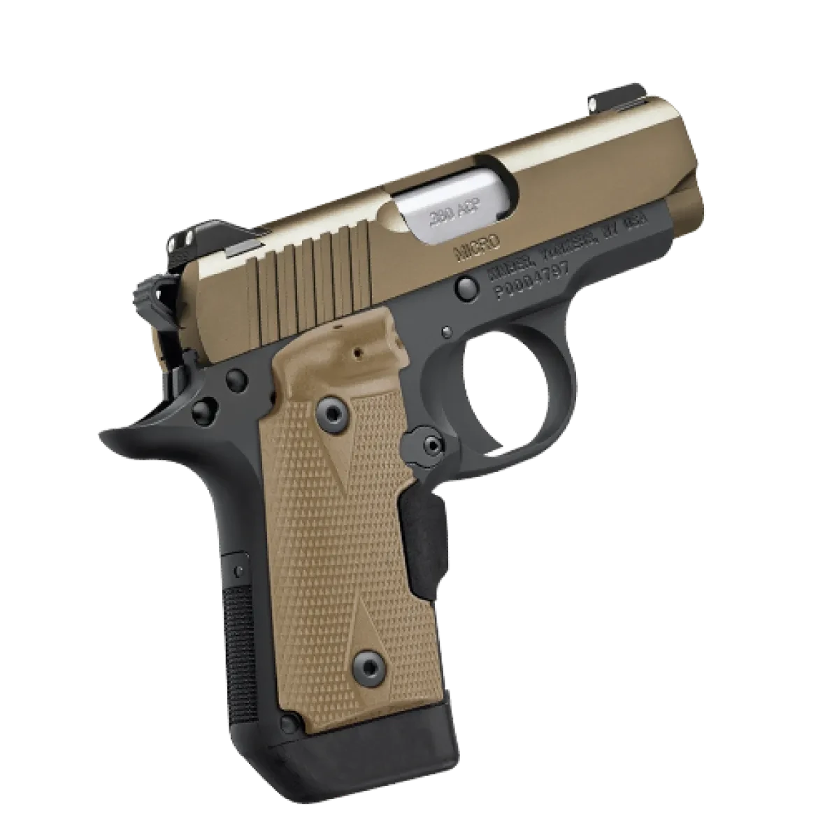 Kimber Micro 380 Desert Tan LG NS łączy intuicyjną obsługę klasycznej platformy 1911 z pełnym pakietem rozwiązań obronnych. Kuty z aluminium 7075-T6 szkielet w kolorze Desert Tan zestawiono z czarnym, satynowym zamkiem ze stali nierdzewnej. Wszystkie krawędzie są sfazowane, a głębokie nacięcia z przodu i z tyłu zamka ułatwiają pewny chwyt podczas przeładowania. Najważniejszym dodatkiem jest chwyt Crimson Trace Lasergrips: czerwony laser włącza się automatycznie po objęciu broni dłonią, dzięki czemu nie trzeba szukać dodatkowych przełączników. Fabryczne przyrządy Tru-Dot Tritium Night Sights świecą w całkowitej ciemności, zapewniając pewne celowanie 24 godziny na dobę. Lufa typu bull o długości 2,75 cala jest osadzona na zintegrowanej rampie podającej, co gwarantuje niezawodne zasilanie i zaskakująco dobrą celność jak na tak mały pistolet. Aluminiowy szkielet, krótka lufa i cienki, jednorzędowy magazynek sprawiają, że broń waży zaledwie 380 g (bez amunicji) i łatwo mieści się w kaburze wewnętrznej lub nawet w kieszeni.