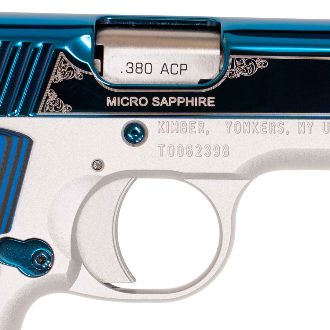 Kimber Micro 380 Sapphire NS to prawdziwa biżuteria w świecie broni ukrytej – miniaturowa wersja kultowej 1911-ki, która zachowała intuicyjną ergonomię oryginału, a jednocześnie mieści się w kieszeni marynarki. Luksusowa powłoka PVD Sapphire Blue na lustrzanie wypolerowanym zamku ze stali nierdzewnej kontrastuje z satynowym szkieletem z anodowanego aluminium 7075-T6. Każda krawędź jest fazowana i wypolerowana, dzięki czemu przy dobyciu nic nie zahacza o odzież, a sam pistolet prezentuje się jak precyzyjny zegarek. Drapieżny charakter podkreśla motyw Raptor Scale™ – łuskowe nacięcia na zamku, front-strapie i drewnianych okładzinach Zebrawood. Nie są to wyłącznie detale estetyczne: głębokie „łuski” stabilizują chwyt podczas szybkiej wymiany magazynka i pewnie prowadzą dłoń w identyczne miejsce przy każdym dobyciu. Aluminiowy szkielet i krótka, bezbushingowa lufa bull-type 2,75″ sprawiają, że broń waży zaledwie 380 g z pustym magazynkiem – niemal nie odczuwa się jej na pasie czy w kieszeni kabury. Oznaczenie NS (Night Sights) to trzypunktowe przyrządy Tritium, które świecą bez baterii nawet po wielu latach, zapewniając pewne celowanie w całkowitej ciemności. Niskoprofilowa konstrukcja eliminuje ryzyko zahaczenia o ubranie, a jasna przednia kapsuła prowadzi oko błyskawicznie na cel w świetle dziennym. Broń pozostaje gotowa 24/7 – niezależnie od tego, czy wychodzisz wieczorem z psem, czy pokonujesz zatłoczoną ulicę o poranku. Wewnątrz krótkiej lufy skok 1:16 LH stabilizuje pociski od 90 gr do 100 gr, a polerowana rampa podająca gwarantuje pewne zasilanie polymerycznych i FMJ-tów. Pełnowymiarowa prowadnica sprężyny oraz sprężyna 8 lb wydłużają żywotność części, a stalowy zamek pochłania tyle energii, by odrzut .380 ACP pozostał przyjemnie łagodny – strzały są szybkie, a powrót na cel natychmiastowy. Skeletonizowany spust 3-hole łamie się czysto (ok. 7 lb) i ma krótki reset, co ułatwia oddawanie kontrolowanych dubletów bez „pływania” palca. Rozszerzony beavertail wprowadza dłoń wysoko pod osią lufy, redukując podrzut i eliminując ryzyko „ukąszenia” kurkiem. Klasyczny bezpiecznik kciukowy i grip-safety tworzą intuicyjny, podwójny system zabezpieczeń – docenisz go zwłaszcza przy przenoszeniu broni z nabojem w komorze. Komorę magazynka sfazowano, aby przyspieszyć jego wymianę, a siedmionabojowy magazynek jednorzędowy pozostawia chwyt zaskakująco smukły, porównywalny z subkompaktami 9 mm. Jeśli potrzebujesz więcej amunicji, aftermarketowe magazynki 8-nabojowe zwiększą pojemność bez znaczącego pogorszenia ukrycia.