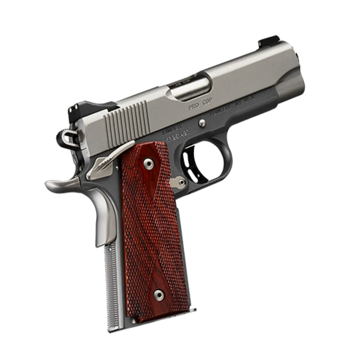 KIMBER Pro CDP (NS) to kompaktowa wersja 1911-ki z pakietu Custom Defense Package, ręcznie dopracowywanego w Custom Shopie Kimbera. Model „Pro” łączy 4-calową lufę klasy match-grade z aluminiowym szkieletem 7075-T6, dzięki czemu masa broni wynosi niespełna 800 g z pustym magazynkiem. Krótszy zamek skraca długość całkowitą do 7,7″ (196 mm), zachowując pełnowymiarowy chwyt pozwalający na pewną obsługę nawet przy szybkich dubletach. Dwutonowe wykończenie – satynowa stal nierdzewna na zamku i matowa czerń KimPro II na szkielecie – nie tylko chroni przed korozją, lecz także redukuje refleksy światła. Proces Carry Melt usuwa ostre krawędzie, dzięki czemu pistolet nie haczy o garderobę podczas dobycia. Wariant NS otrzymuje niskoprofilowe, trójpunktowe Tritium Night Sights, zapewniające wyraźny kontrast w dzień i w nocy bez zwiększania gabarytów. Aluminiowy szkielet mieści zawieszoną na pręcie prowadnicy sprężynę powrotną o masie 14 lb, dobraną do amunicji 9 mm Luger; układ ten skutecznie pochłania odrzut, a jednocześnie zachowuje niezawodny cykl pracy. Checkering 30 LPI na frontstrapie i mainspring housing stabilizuje dłoń, a szkieletowy kurek i aluminiowy spust match (ok. 1,9 kg oporu) umożliwiają szybki, kontrolowany reset. Powiększony beavertail z wyraźnym „bumpem” prowadzi dłoń wysoko pod linię lufy, eliminując ryzyko hammer bite, a obustronny bezpiecznik skrzydełkowy ułatwia obsługę strzelcom lewo- i praworęcznym. Brak szyny akcesoryjnej pod lufą pozwolił zachować smukły profil – kluczowy przy skrytym noszeniu broni w kaburach IWB, OWB czy appendix. Okładziny z drewna różanego w klasycznym wzorze Double Diamond dopełniają ergonomii i dodają elegancji, którą docenią także kolekcjonerzy.