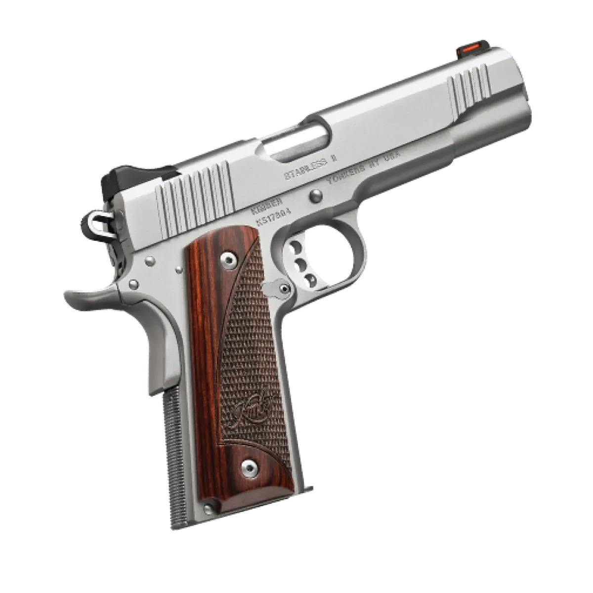 KIMBER STAINLESS TARGET II; kal.: 9 × 19 mm Kimber Stainless Target II to pełnowymiarowy pistolet 1911 zaprojektowany dla strzelców sportowych, którzy szukają połączenia klasycznej estetyki oraz match-grade’owej precyzji w amunicji 9 × 19 mm. Konstrukcja w całości ze stali nierdzewnej zapewnia wyjątkową sztywność, stabilność na linii ognia i odporność na warunki atmosferyczne, a satynowe wykończenie Satin Silver podkreśla elegancką linię legendarnego wzoru Johna Browninga. Stworzony do tarczy i dynamiki Wersję Target wyposażono w w pełni regulowany przeziernik (micrometer adjustable) oraz szeroką muszkę typu blade, co pozwala precyzyjnie dostroić punkt trafienia do konkretnej naważki, dystansu czy warunków oświetleniowych. Dzięki mniejszemu podrzutowi naboju 9 mm pistolet zachowuje błyskawiczny powrót na cel, czyniąc go idealnym narzędziem do konkurencji PPC, IPSC Classic, IDPA oraz strzelectwa precyzyjnego na dłuższych dystansach. Mechanika pewna jak szwajcarski zegarek Jednosprężynowy zespół powrotny o wartości 12 lbs został tak dobrany, aby zminimalizować podrzut lekkiego pocisku 9 mm i jednocześnie zagwarantować niezawodne przeładowanie na szerokim spektrum amunicji – od miękkich 124 gr RN po sportowe 147 gr FMJ. Długie prowadnice suwadła i indywidualnie dopasowana lufa match-grade o długości 5″ pracują bez luzów nawet po tysiącach strzałów. Standardowy, jednorządowy magazynek mieści dziewięć nabojów, a konstrukcja gniazda akceptuje popularne stopki powiększające, jeśli regulamin zawodów na to pozwala. Ergonomia pod presją czasu Profilowane okładziny z drewna rosewood zapewniają pewny chwyt niezależnie od warunków pogodowych, a rozszerzony beavertail z wysokim „podcięciem” pozwala osadzić pistolet głęboko w dłoni, jeszcze bardziej redukując odczuwalny odrzut 9 mm. Powiększone skrzydełko bezpiecznika kciukowego pracuje gładko, a jednocześnie wyraźnie sygnalizuje zapięcie – co docenisz na przebiegu „parkurowym”, gdzie liczy się każdy ułamek sekundy. Spust, który „łamie szkło” Fabryczny mechanizm oferuje krótki pre-travel, czyste przełamanie w granicach 4–4,5 lbs (≈ 1,8–2 kg) i natychmiastowy reset. W praktyce pozwala to oddawać serie kontrolowanych dubletów z zachowaniem skupienia w granicach 1,5–2″ na 25 yd, często bez konieczności dodatkowego tuningu gunsmith. Trwałość i bezpieczeństwo Zamek i szkielet wytoczono ze stali nierdzewnej serii 400, a ich powierzchnia o twardości ~40 HRC gwarantuje wysoką odporność na zużycie. Pistolet przechodzi fabryczne testy z amunicją +P, co potwierdza jego wytrzymałość na ostrzejsze ładunki obronne. Wewnętrzny blok iglicy (Series II) uniemożliwia przypadkowy wystrzał przy upadku broni, spełniając najbardziej restrykcyjne normy bezpieczeństwa.