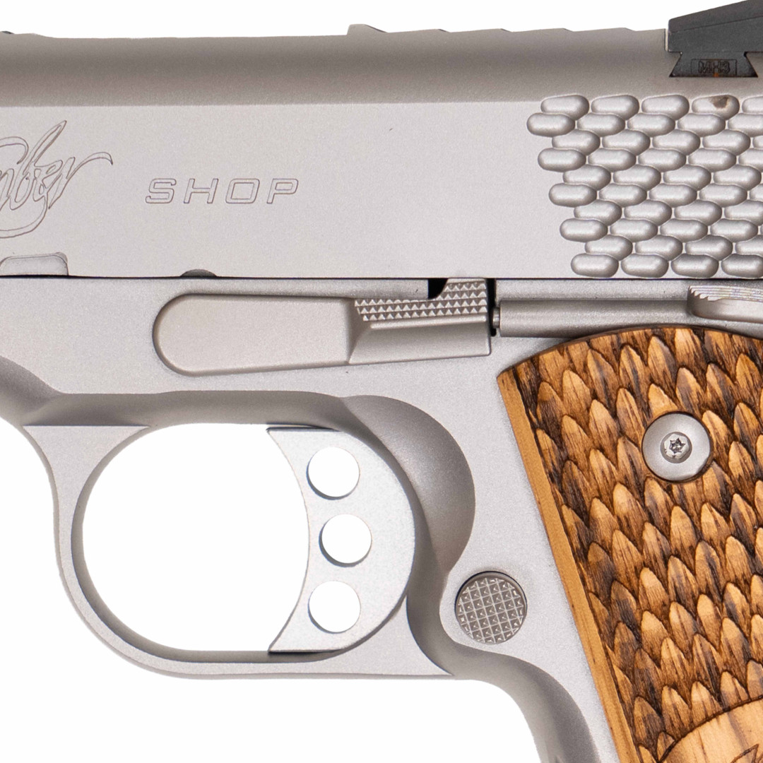 Kimber Stainless Pro Raptor II NS to „średniak” w rodzinie Raptor – skrócona, czterocalowa wersja kultowego modelu, która łączy wyjątkową stylistykę Custom Shopu z praktycznym formatem do całodziennego noszenia. Oznaczenie NS (Night Sights) oznacza fabryczny montaż trójpunktowych przyrządów z kapsułkami trytu, świecących w ciemności bez potrzeby zewnętrznego zasilania. Satynowe wykończenie stali nierdzewnej podkreśla elegancję, a charakterystyczne ryflowania Raptor Scale™ – inspirowane łuskami drapieżnika – nadają broni agresywny wygląd i gwarantują pewny chwyt. Najważniejsze cechy W pełni stalowa, nierdzewna konstrukcja Zamek i szkielet frezowane z bloków stali 416 SS zapewniają wyjątkową odporność na korozję. Masa ok. 35 oz (pusty magazynek) pochłania energię naboju .45 ACP, dzięki czemu pistolet jest zaskakująco łatwy w kontroli mimo kompaktowych gabarytów. Lufa match-grade 4″ Kutą, nierdzewną lufę osadzono w tulei bushing fit, co utrzymuje idealną współosiowość z zamkiem i pozwala uzyskiwać skupienia sub-2″ na 25 m przy amunicji klasy premium. Klasyczny gwint 1:16 RH stabilizuje zarówno lekkie, jak i ciężkie pociski .45 ACP. Motyw Raptor Scale™ 360° Łuskowe nacięcia pojawiają się z przodu i z tyłu zamka, na górnym profilu szkieletu, front-strapie oraz na okładzinach z drewna zebrawood. Zapewniają agresywną przyczepność w rękawicach i nadają broni niepowtarzalny, customowy charakter. Rozszerzony beavertail i wysokie podcięcie kabłąka Prowadzą dłoń wysoko pod osią lufy, minimalizując podrzut i eliminując ryzyko „ukąszenia” kurkiem – kluczowe przy mocnym naboju .45 ACP w krótszej lufie. Skeletonizowany spust klasy match Aluminiowy język spustowy 3-hole łamie się czysto przy ~4 lb i ma krótki reset, co ułatwia błyskawiczne dublety i precyzyjne strzały, czy to w IDPA, czy na ośmio-pierścieniowym tarczowaniu na 25 m. Nocne przyrządy Tritium Stalowa muszka i szczerbina z zielonymi kapsułkami trytu gwarantują wyraźny obraz celowniczy w pełnym słońcu i w całkowitej ciemności, zwiększając pewność przy strzelaniu obronnym. Zastosowanie Stainless Pro Raptor II NS to idealny kompromis między pełnowymiarową ergonomią Government-size a mobilnością wersji „Commander”. Czterocalowa lufa poprawia balans i skraca drogę dobycia z kabury IWB, a w pełni stalowa masa łagodzi odrzut. To klasyczny pistolet EDC dla strzelców, którzy ufają sile obalającej .45 ACP i cenią prestiż customowej 1911-ki.