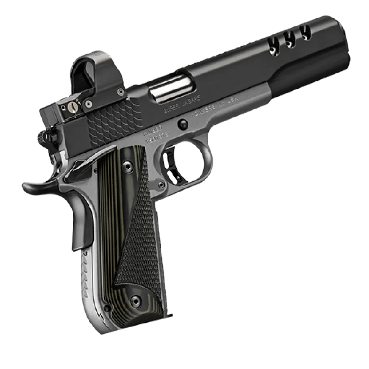 KIMBER Super Jägare (szw. „Łowca”) powstał z myślą o myśliwych i strzelcach terenowych, którzy potrzebują mocnej, precyzyjnej 1911-ki zdolnej zatrzymać zwierzynę grubego zwierza przy jednoczesnym zachowaniu ergonomii klasycznego, jednoczesnego spustu single-action. Konstrukcja bazuje na stalowej ramie i zamku wykonanych ze stali nierdzewnej, ale dzięki głębokim oknom odciążającym w górnej części zamka oraz portowanej lufie match-grade o długości 6″ odrzut 10 mm Auto jest zadziwiająco łatwy do opanowania, a masa broni nie przekracza 1 160 g z pustym magazynkiem. Fabryczny pakiet myśliwski obejmuje wyfrezowane pod optykę gniazdo typu Docter/Trijicon wraz z fabrycznie montowanym kolimatorem Leupold DeltaPoint Pro 2,5 MOA (wersje eksportowe mogą być dostarczane bez urządzenia). Wysokie, jednopunktowe przyrządy awaryjne (stalowa muszka z wstawką światłowodową) współpracują z celownikiem, nie zasłaniając pola widzenia. Poszerzone nacięcia kabłąkowe na zamku, powiększony beavertail i agresywne radełkowanie 24 LPI na frontstrapie stabilizują chwyt nawet w rękawicach myśliwskich. Wykończenie KimPro II w odcieniu Dark Earth na szkielecie ochroni przed korozją i zarysowaniami, a dwutonowy zamek (satynowa stal + czarne, płaskie krawędzie DLC) likwiduje odblaski w jasnym słońcu. Wewnętrznie polerowane rampy podające wraz z rampowaną komorą lufy zwiększają niezawodność z ciężkimi pociskami 200–220 gr, a pełny pręt prowadnicy stabilizuje pracę zamka przy zimowej, wolniejszej amunicji. Spust match-grade prosty, aluminiowy, oferuje opór około 1,8 kg i krótki reset. Jednostronny bezpiecznik kciukowy ogranicza ryzyko przypadkowego rozbrojenia broni, a łezkowe wycięcie pod bezpiecznikiem chwytowym ułatwia pewny, wysoki chwyt. 8-nabojowe magazynki ze stali nierdzewnej zakończono szeroką stopką ułatwiającą dobijanie w rękawicach.