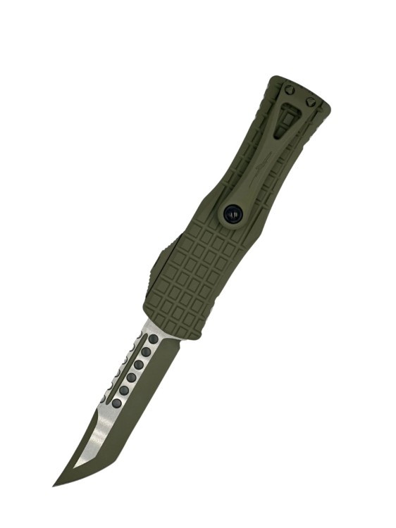 MICROTECH HERA HELLHOUND FRAG SIGNATURE SERIES CERAKOTE FOREST GREEN STANDARD 919-1FRCFTS Limitowany nóż automatyczny OTF z prestiżowej linii Signature Series zaprojektowany z myślą o użytkownikach EDC, operatorach oraz kolekcjonerach, którzy oczekują nie tylko doskonałej funkcjonalności, ale i unikalnego designu. Model 919-1FRCFTS łączy kompaktową formę z agresywnym ostrzem Hellhound oraz wytrzymałą rękojeścią w kolorze Forest Green. Ostrze typu Hellhound Tanto rozpoznawalne dzięki frezowanym detalom i agresywnej geometrii wykonano z wysokiej klasy stali Böhler M390, która zapewnia znakomite trzymanie ostrości, odporność na ścieranie i korozję. Wykończenie Cerakote w odcieniu Forest Green nadaje mu wyjątkowego, taktycznego charakteru i zabezpiecza powierzchnię przed zużyciem. Rękojeść z aluminium 6061-T6 wyfrezowano w stylu Frag Pattern, co poprawia chwyt i dodaje stylu. Mechanizm double-action OTF (Out-The-Front) umożliwia szybkie i płynne wysuwanie ostrza przy użyciu suwaka bocznego. Całość dopełnia tytanowy klips z kulką typu rollerball oraz zbijak do szyb z węglika wolframu.