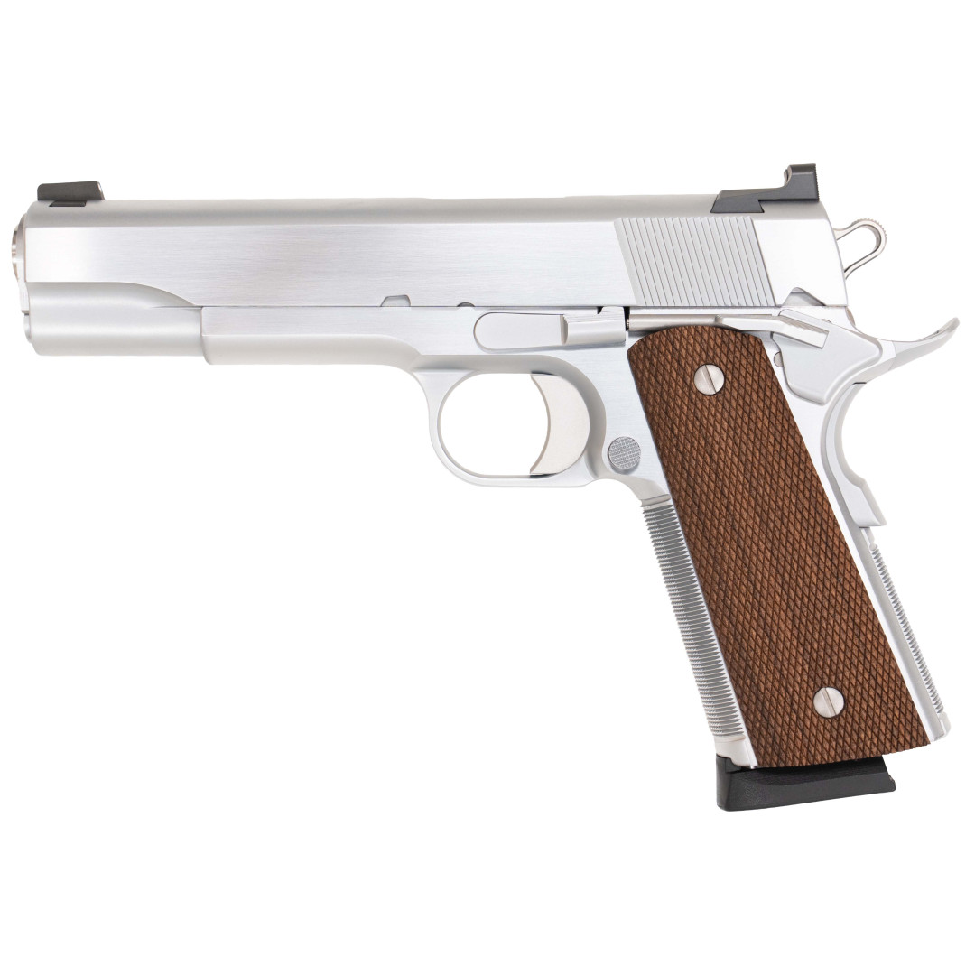 Chwyt uzupełniają drewniane okładziny o klasycznym nacięciu, które dobrze komponują się z jasnym szkieletem i zamkiem. Układ jest typowy dla 1911: spust prosty, jednorzędowy magazynek, klasyczne przyrządy celownicze oraz zwarta, harmonijna sylwetka.