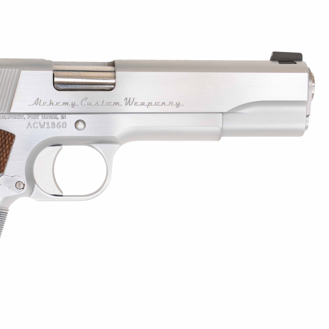 Alchemy Custom Weaponry Prime to dopracowana interpretacja platformy 1911 w nowoczesnym kalibrze 9×19 mm, łącząca klasyczną ergonomię z wyraźnie „customowym” wykończeniem. Na zdjęciach widać satynowo-szczotkowaną powierzchnię, spójne pasowanie elementów oraz estetyczne, precyzyjne grawerowanie.