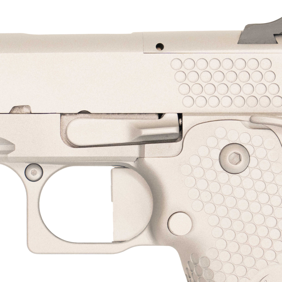 Kompaktowy 1911/2011 w rozmiarze Commander w kalibrze 9×19 mm, z naciskiem na szybkie cyklowanie zamka (odciążenia/cięcia na zamku) i gotowość pod optykę (Trijicon RMR). Model z serii „Boardroom” w układzie double stack, z dopracowanym spasowaniem i sportowo-taktycznym charakterem.