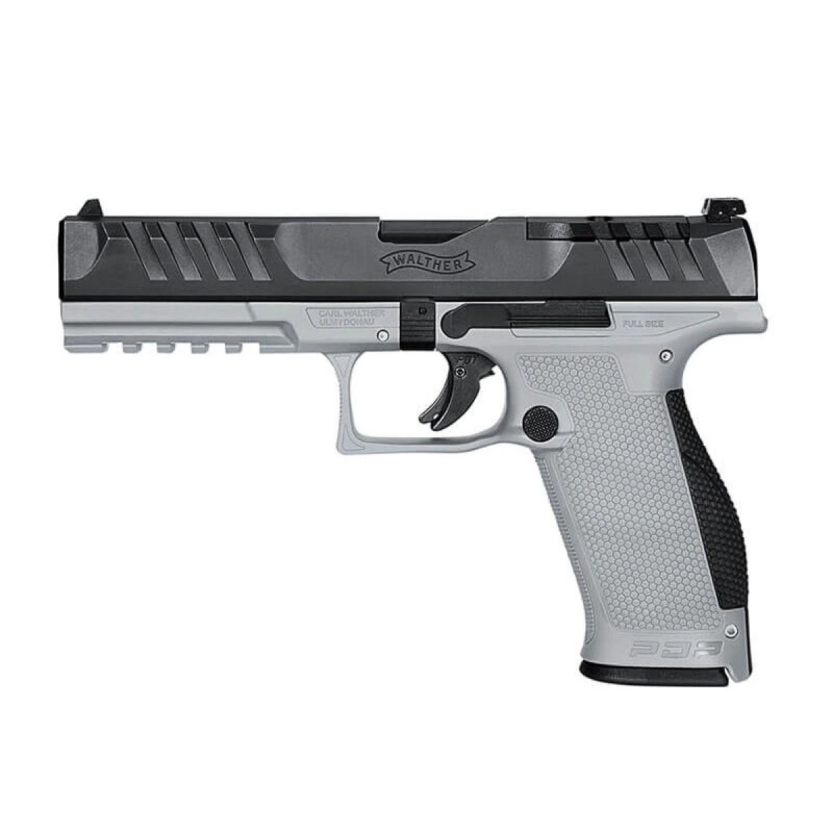 Walther PDP (Performance Duty Pistol) w wersji FS 5.0″ OR to pełnowymiarowy pistolet samopowtarzalny kalibru 9 × 19 mm, zaprojektowany z myślą o sportowcach IPSC, użytkownikach służbowych oraz entuzjastach broni poszukujących maksymalnej celności i gotowości pod optykę. Polimerowy szkielet, barwiony w masie w odcieniu Tungsten Grey (Cerakote H-237), nadaje broni elegancki, grafitowo-metaliczny wygląd i zapewnia wysoką odporność na ścieranie oraz zarysowania. Model wyposażono w lufę 5-calową (127 mm) pokrytą powłoką Tenifer®. Dłuższa lufa wydłuża linię celowania, poprawia balistykę i pozwala uzyskać łagodniejszy odrzut, co przekłada się na lepsze skupienie przy ogniu szybkim. Zamek posiada fabryczne frezowanie Optics Ready oraz zestaw wymiennych płytek, umożliwiających bezproblemowy montaż najpopularniejszych mikrokolimatorów (Trijicon RMR/SRO, Holosun 407/507/508, Shield RMS/C, Leupold DPP) bez utraty gwarancji. Mechanizm striker-fired wykorzystuje Performance Duty Trigger z oporem ok. 2,5 kg i wyraźnym, krótkim resetem, co ułatwia kontrolę broni przy szybkim ciągu strzałów. Pewność chwytu gwarantuje agresywna Performance Duty Texture na rękojeści, uzupełniona głębokimi SuperTerrain Serrations na zamku, dzięki którym manipuluje się bronią pewnie także w rękawicach lub mokrych dłoniach. Dodatkową ergonomię zapewniają obustronna dźwignia zrzutu zamka, przekładalny zwalniacz magazynka i trzy wymienne backstrapy (S/M/L), pozwalające idealnie dopasować pistolet do dłoni strzelca. Pełnowymiarowa szyna Picatinny MIL-STD-1913 umożliwia montaż latarek, laserów i innych akcesoriów, czyniąc PDP FS 5.0″ kompletną platformą do użytku sportowego, służbowego i obronnego. Nisko osadzona lufa (niski bore axis) oraz głęboki beavertail zmniejszają podrzut i przyspieszają powrót na cel, zwiększając szybkość kolejnych strzałów.