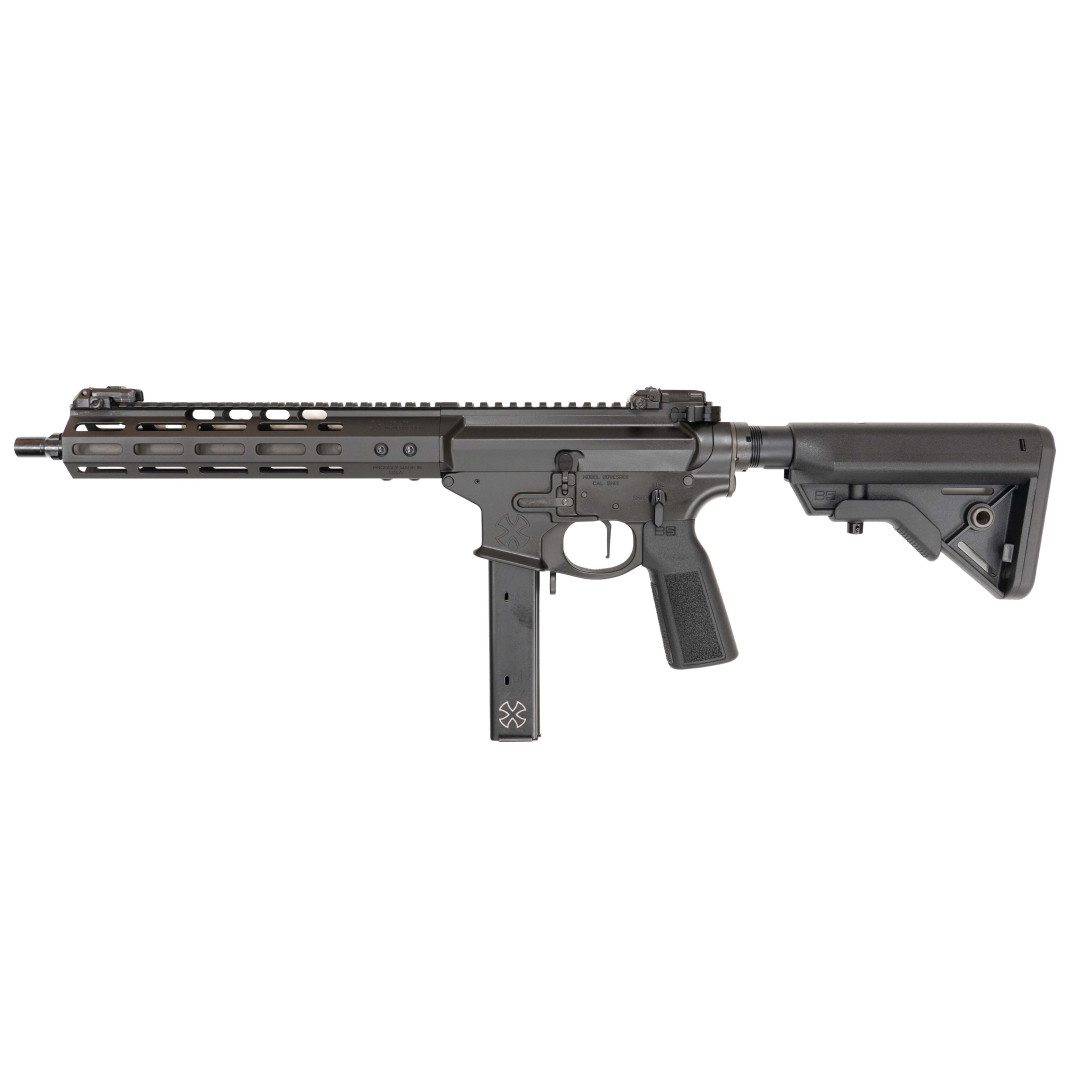 Model NOVESKE9 Gen 4 w wersji 10.5” łączy kompaktowe gabaryty z dopracowaną ergonomią. Konstrukcja bazuje na billetowym (precyzyjnie frezowanym) szkielecie z aluminium 7075-T6, z powiększonym gniazdem magazynka, zintegrowanym dużym kabłąkiem spustu oraz regulacją dopasowania upper/lower (śruba napinająca). Zastosowano obustronne rozwiązania: zwalnianie zamka, zwalnianie magazynka (łopatkowe + klasyczne AR po prawej), a także selektor. Całość wykończono powłoką Armor Black Cerakote. W zestawie są stalowe, regulowane przyrządy Magpul MBUS Pro, a konstrukcja korzysta z magazynków typu Colt 9mm (32-nab.).