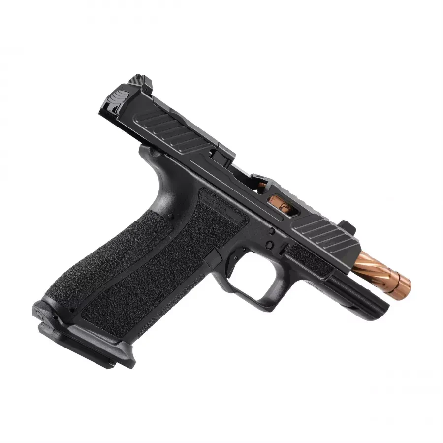 Pistolet samopowtarzalny Shadow Systems DR920 kal. 9x19 mm – Elite Slide, Bronze Spiral Threaded Barrel Shadow Systems DR920 to pełnowymiarowy pistolet samopowtarzalny klasy duty/defense, zaprojektowany z myślą o profesjonalistach i zaawansowanych użytkownikach cywilnych. Model ten oparty jest na sprawdzonej platformie Glock 17, ale oferuje szereg udoskonaleń konstrukcyjnych i materiałowych, które plasują go w klasie premium. Wersja z zamkiem Elite, spiralną gwintowaną lufą w wykończeniu Bronze TiCN oraz prowadnicą SS Rod to połączenie funkcjonalności, niezawodności i wyrazistej stylistyki. DR920 Elite to konstrukcja fabrycznie przygotowana do montażu kolimatorów optycznych. Dzięki wycięciu Optic Cut w zamku, broń współpracuje z najpopularniejszymi mikrokolimatorami (m.in. Holosun, Trijicon RMR, Leupold DPP) bez potrzeby stosowania dodatkowych adapterów. Dodatkowe nacięcia z przodu, z tyłu i na górze zamka poprawiają kontrolę i komfort pracy z bronią, nawet w rękawicach. Lufa o długości 5 cali została wykonana ze stali nierdzewnej klasy 416R, posiada spiralne frezy poprawiające chłodzenie i redukujące masę. Gwint 1/2x28 pozwala na bezproblemowy montaż tłumika lub kompensatora. Wykończenie Bronze TiCN (tytanowo-nitrylowe) zwiększa odporność powierzchni na zużycie, a jednocześnie nadaje broni nowoczesny, taktyczny wygląd. Czarna polimerowa rama wyposażona jest w agresywne teksturowanie, wymienne nakładki chwytu (backstrapy), pogłębiony łuk pod spustem (undercut) i profilowany beavertail. Wszystko to zapewnia komfortowy, stabilny chwyt i pewną kontrolę podczas dynamicznego strzelania. Wewnątrz zastosowano stalową prowadnicę sprężyny powrotnej (SS Rod), co gwarantuje trwałość oraz stabilną pracę zamka nawet przy intensywnym użytkowaniu. Pistolet posiada mechaniczne przyrządy celownicze z muszką trytową (zielona) oraz czarną szczerbinką z poziomymi nacięciami przeciwodblaskowymi (Black Serrated), co umożliwia szybkie i precyzyjne zgrywanie przyrządów niezależnie od warunków oświetleniowych. Spust w modelu DR920 to konstrukcja flat-faced (płaska), aluminiowa, o sile nacisku około 2–2,3 kg. Charakteryzuje się bardzo krótkim, wyczuwalnym resetem i zintegrowanym zabezpieczeniem typu drop-safe.