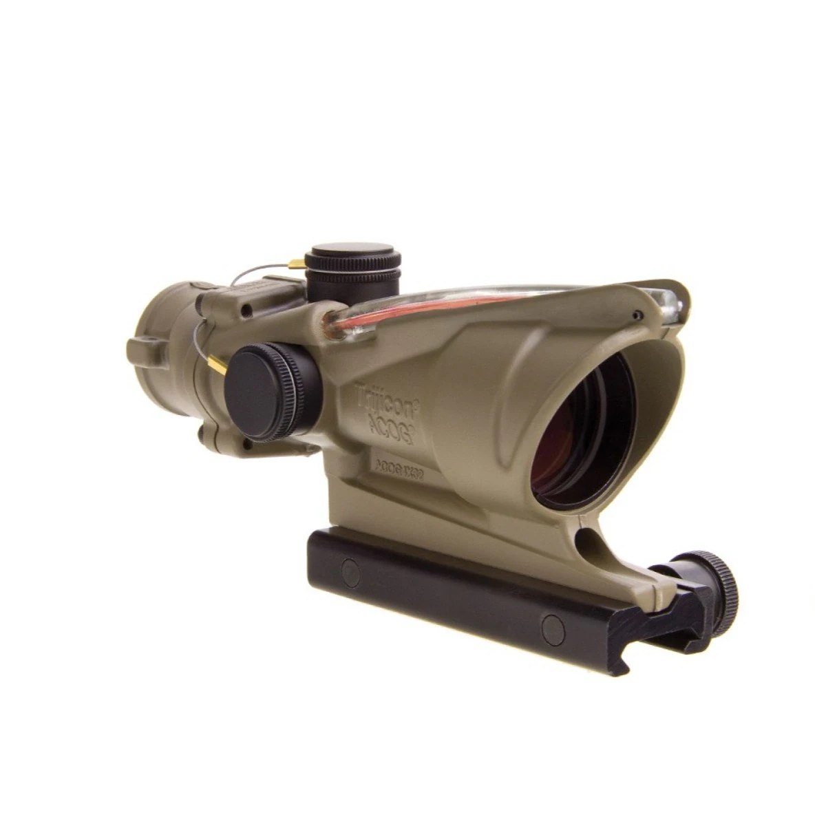 Celownik pryzmatyczny ACOG, stałe powiększenie 4×, obiektyw 32 mm. Siatka typu Red Chevron z kompensacją opadania dla naboju .223/5.56 mm (wersja BAC = Bindon Aiming Concept), co pozwala na strzelanie przy obu oczach otwartych. Powłoka Cerakote w kolorze Flat Dark Earth (FDE) – odcień ziemisty/pustynny. Mount typu TA51 flattop. Reticle dual-illumination: światłowód + tryt.
