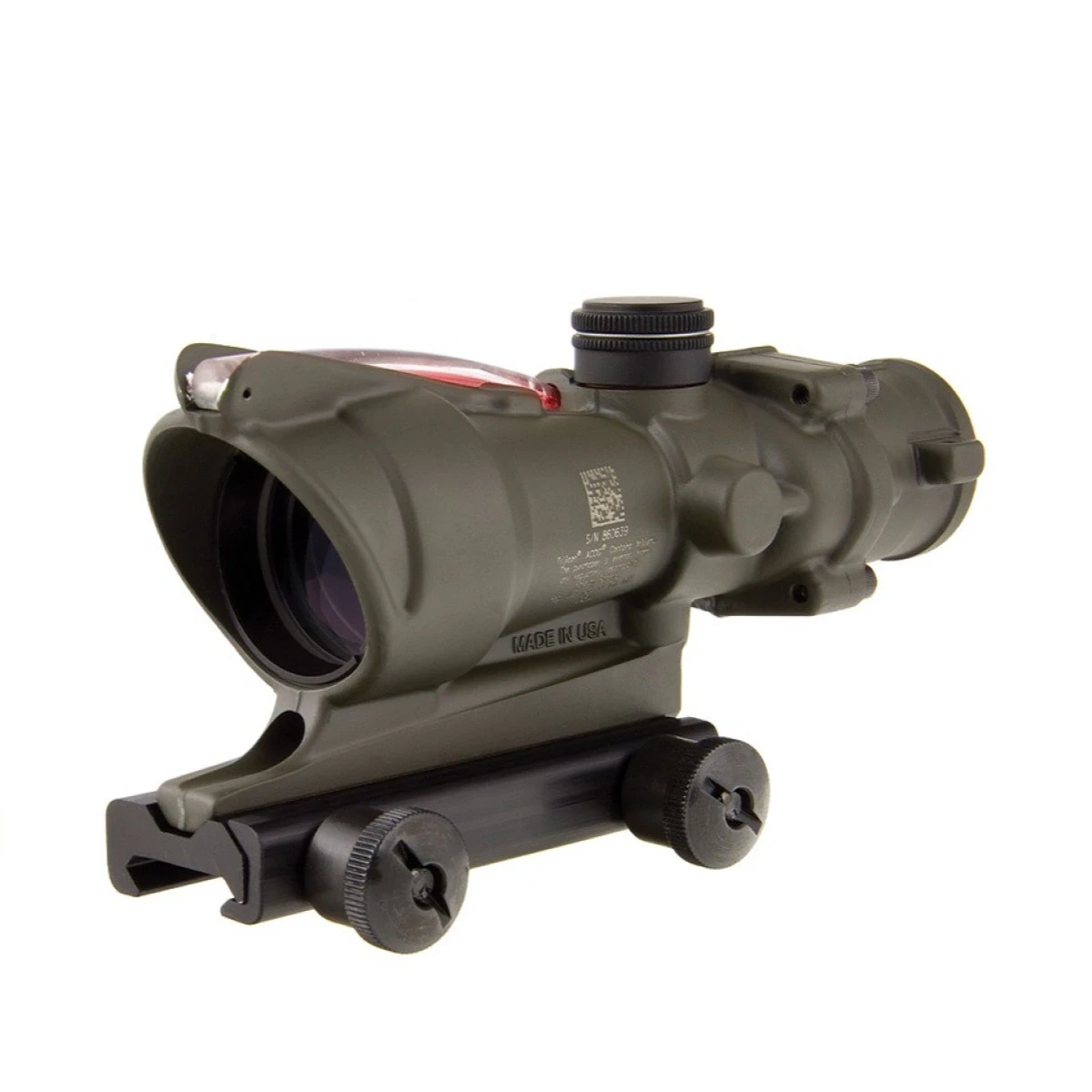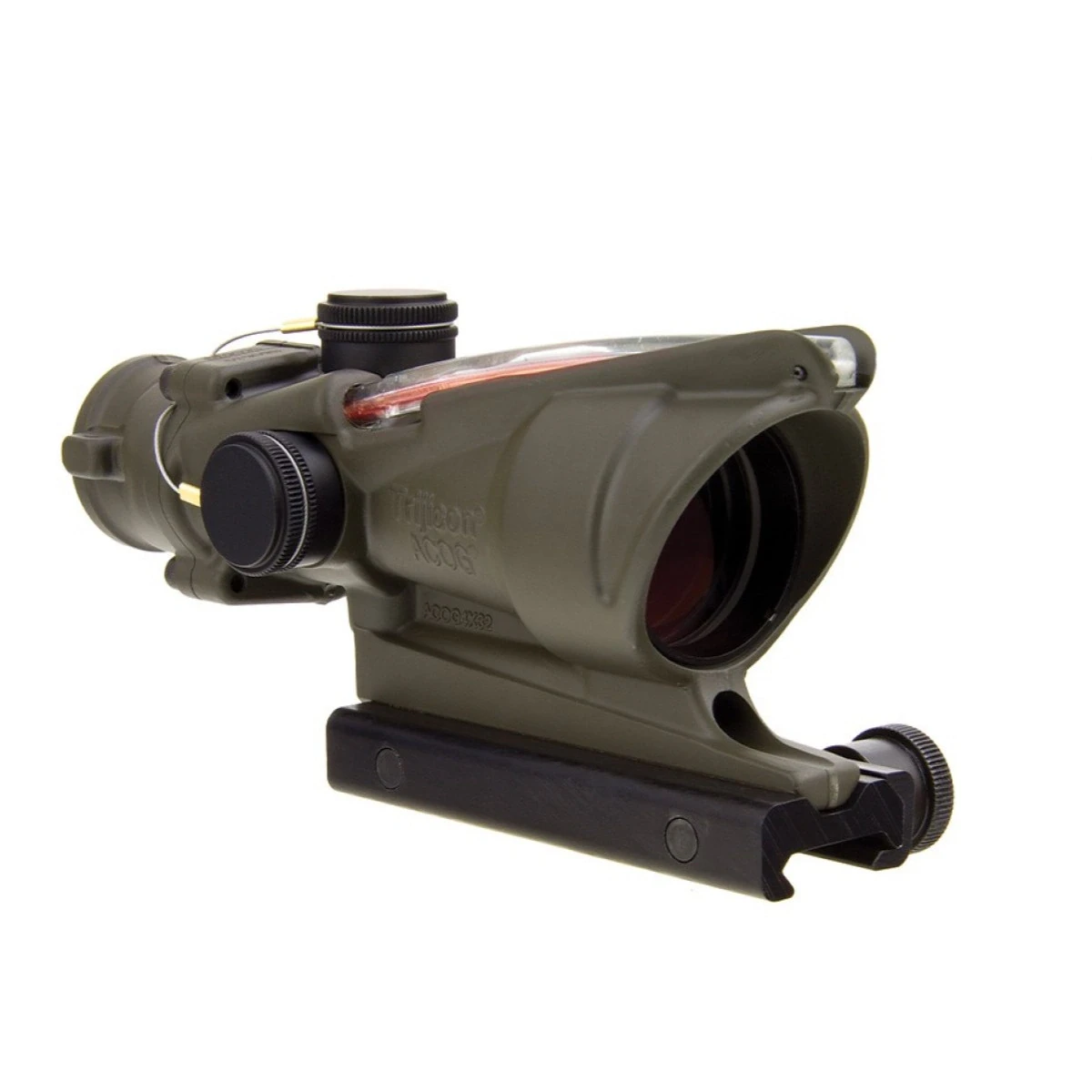 Celownik bojowy pryzmatyczny ACOG 4×32, model z siatką Red Chevron z funkcją BAC (Bindon Aiming Concept). Wykończenie: CK ODG (Cerakote Olive Drab Green). Reticle zaprojektowany dla karabinów flattop w kalibrze .223 / 5.56, z kompensacją opadania pocisku do ok. 800 m. Używany bez baterii — dualne podświetlenie trytem i światłowodem. W zestawie montaż typu TA51 (Flattop thumbscrew mount).